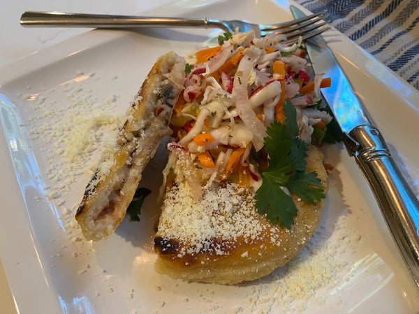 Serve the Pupusas with the curtido on top or on the side along with your favorite hot sauce (I’m partial to the green Tabasco) and a dollop of sour cream if you wish. I also sprinkled the top of our Pupusas with finely grated cotija cheese.