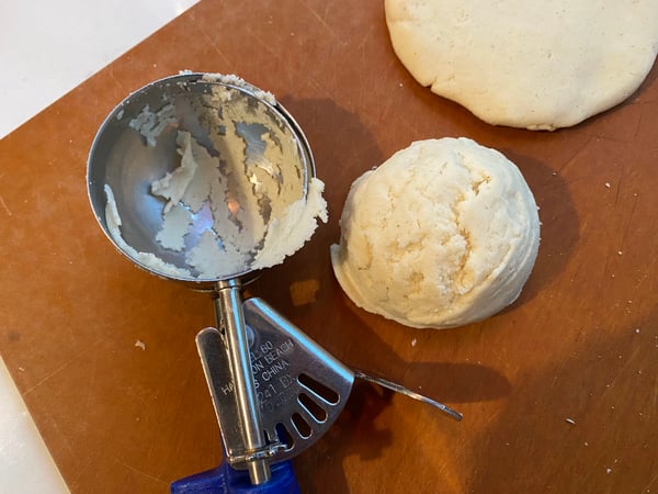 The first step is to use a 2-ounce scoop to portion the dough into 8 balls, just be sure to keep the portions covered with plastic wrap to prevent a skin from forming.