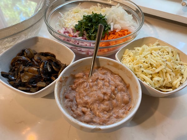 While the dough is rehydrating, you can work on your filling ingredients and curtido. For the filling, I used up items I had in my kitchen such as canned pinto beans that I drained, rinsed and mashed with a fork, mushrooms that I sautéed, and pepper jack cheese that I grated.