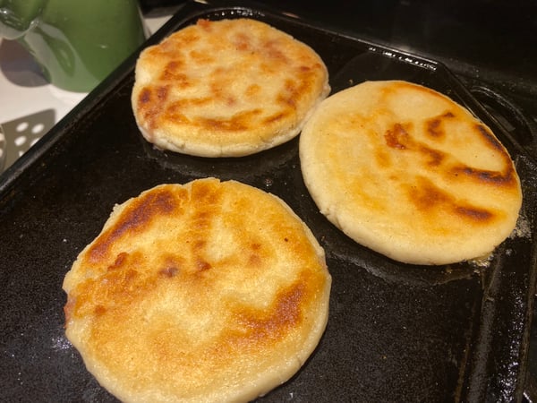 Once you have all of your Pupusas assembled, heat a griddle or nonstick pan over medium heat and add a thin layer of neutral oil such as grapeseed or canola. Cook the Pupusas on the first side until golden brown and crisp, 4 to 5 minutes. Flip and repeat with the other side… some of my beans and cheese started oozing out, but only a little bit.