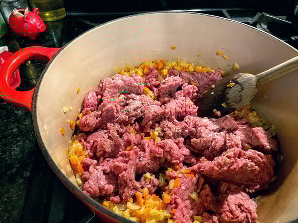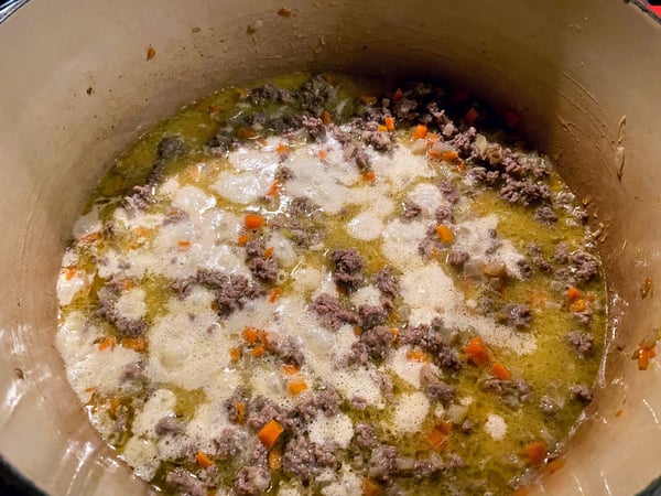 Once the mirepoix has been cooked, add your ground beef. Fat is your friend here. Use an 80/20 blend ground beef, preferably ground chuck. The fat in the beef adds to the richness and silkiness of the sauce, so don’t shy away from the fatty goodness. You only need to cook the beef until it’s no longer pink; it doesn’t need to be browned. And, please do not drain off any excess fat.