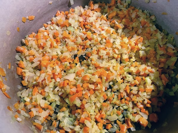 1. Heat a heavy pot over medium heat and add the butter and olive oil. Gently sauté the onion, celery and carrot until lightly softened, 5 to 6 minutes.