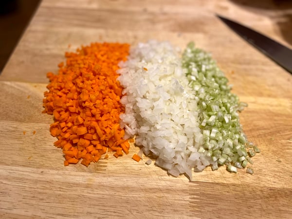 The opening act in this undisputed-king-of-all sauces recipe is finely diced mirepoix (carrots, onions and celery). These three vegetables are the base for many soups, stocks, sauces and braises, and Bolognese puts them to good use. Slowly cooking the vegetables in a mix of olive oil and butter until they are softened bring a sweetness to the sauce that helps balance the acidity of the tomatoes.