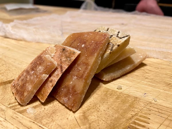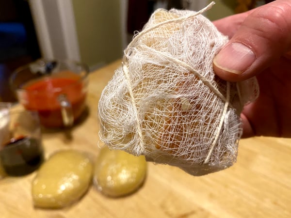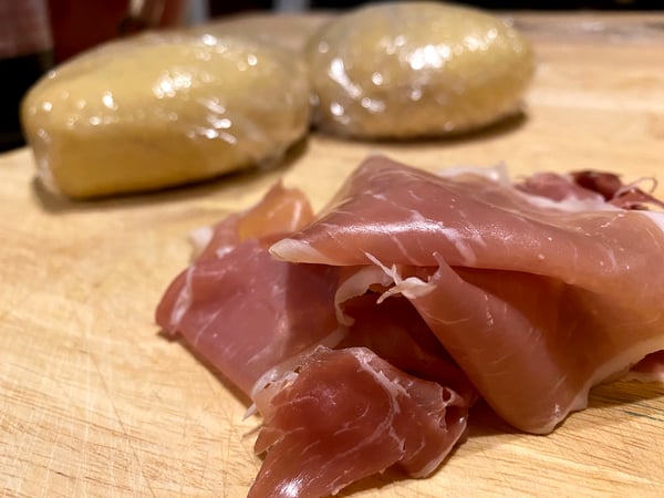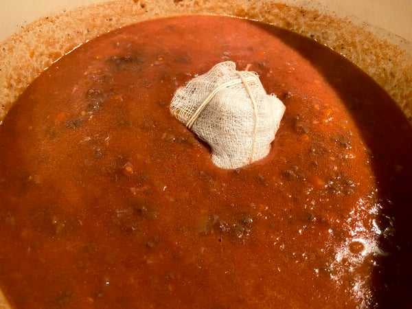 I had some parmesan cheese rinds I wanted to use up, so I added them to the ragú… they really add a depth of savory goodness when allowed to simmer in a long-cooked sauce. I wrapped the rinds up in cheesecloth, and then secured my bundle with twine to make it easier to remove. I also had a few slices of prosciutto around, so I chopped them up and stirred them into the sauce.