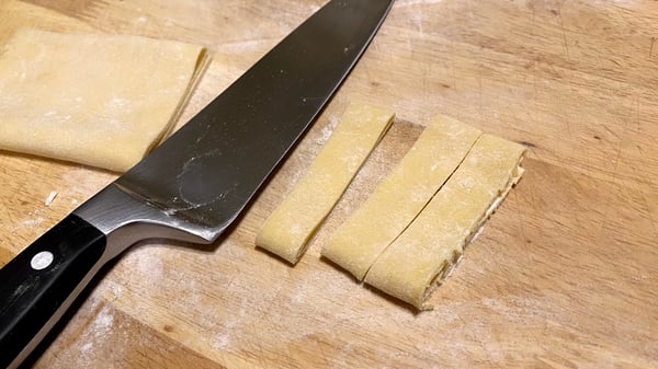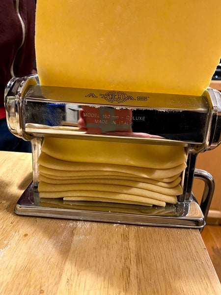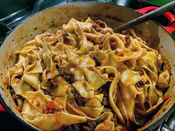 Because I was on a pasta-lovers quest, I made homemade pasta while my sauce simmered. The traditional pasta to serve with sauce Bolognese is tagliatelle, long, hand-cut noodles that measure 1/4 to 1/3-inch wide. My noodles were somewhere between tagliatelle and pappardelle, which are a bit wider. I was more focused on enjoying myself than measuring my noodles. You could also use 1 pound of any dried noodles you like, so if making fresh isn’t in the cards, no worries!