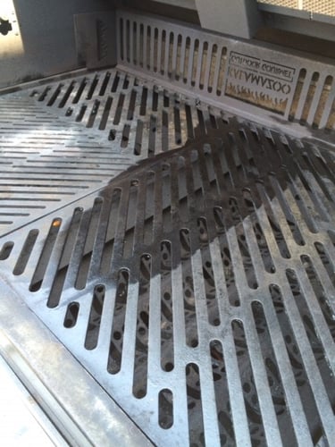 Pour your oil into a bowl, then roll up your towel. Using the tongs, apply oil to the hot cooking grates, making sure to coat every surface that comes into contact with food. You can see the difference between the seasoned and unseasoned areas below: