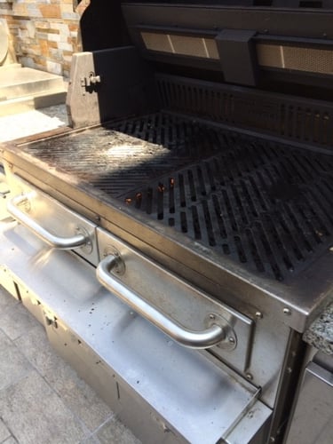 Of course, if you don’t have this product around the house, you can definitely use dish soap or any other product that takes off heavy stains and dirt. Take a little bit of your product on a sponge, then begin to scrub the exterior of your grill. You may need to scrub pretty hard, but make sure not to scrub so hard that you scratch your grill’s exterior! Check occasionally to make sure that you’re not causing any damage. For stainless steel grills, make sure that you scrub along the grain of the stainless, because it can scratch quite easily. Here’s the before and after of a little heavy scrub with Universal Stone: