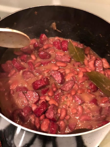 After your beans have soaked, rinse them and put into a pot. Add fresh water and a bay leaf or two (I added way too many in the picture below). Allow the beans to come to a simmer while stirring and adding a little bit of water every few minutes. After about a half hour, add your Holy Trinity and seasoning. Please don’t let the beans thicken just yet, you want them to be watery until about the last 15 minutes.