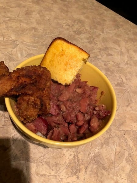 People plate their red beans differently. I like to top the rice with red beans. If I am making red beans, I am also making corn bread and fried chicken. It is only right!
