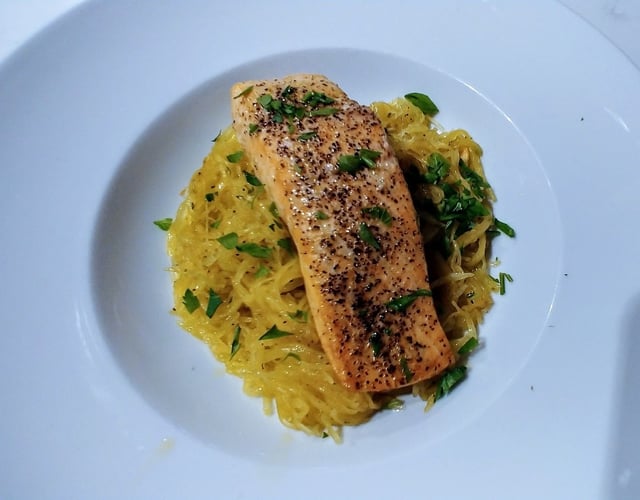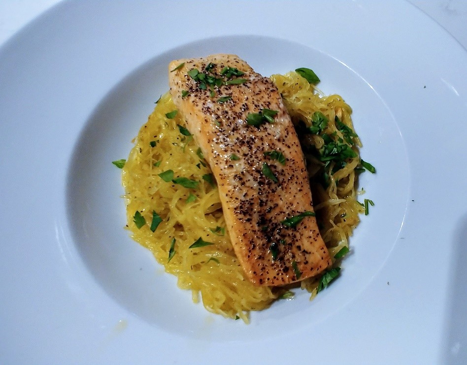 As for what to do with your beautiful strands of spaghetti squash, the options are really endless. One of my favorite ways is to warm some thinly sliced garlic in olive oil along your choice of herbs and/or red pepper flakes and cooking just until the garlic barely begins to turn a slightly brown at the edges. Quickly toss with your spaghetti squash strands, season to taste with salt and pepper, and top with grated Parmigiano-Reggiano – delicious! When I made this last night, I had already thawed some salmon, so I skipped the cheese and topped the squash with the salmon – it was a meal I would never have imagined myself enjoying as little as six months ago. No mushy strands here!