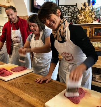 Before the first pasta was rolled or the first cork popped, Rose spotted a familiar face while our travelers waited for the Florence walking tour to begin. She and Miguel had cooked side by side in Culinary Boot Camp back in October 2022, partnered for their final meal. They hadn’t seen each other since - until Tuscany. Recognition came slowly, then joyfully. From that moment on, they were inseparable in the kitchen and often documented in photos by Miguel's wife, Cindy. They were the first to volunteer at every hands-on class, laughing and chopping like no time had passed at all.