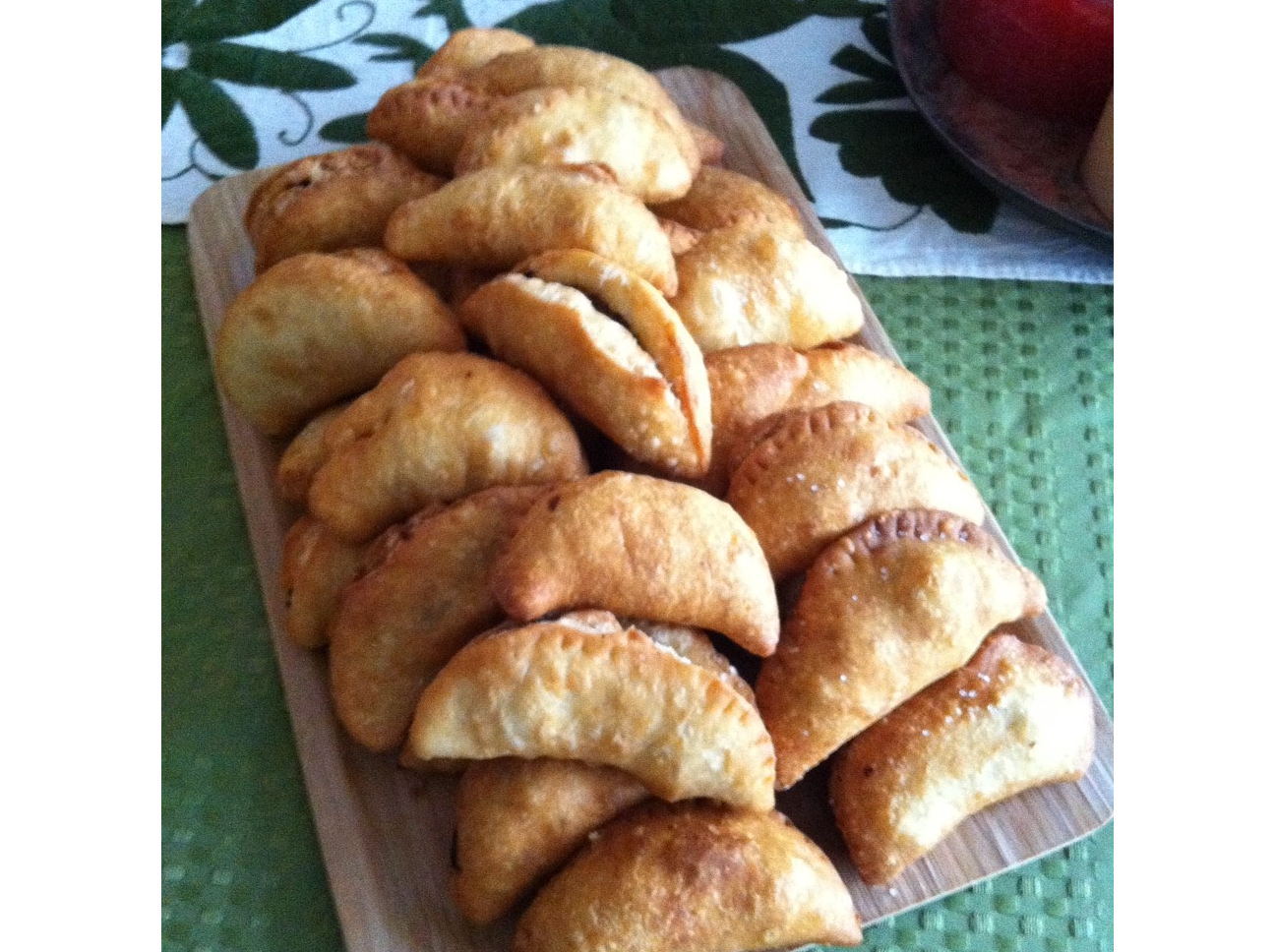 This traditional hand pie has a savory meat filling in a crescent-shaped, flaky pastry turnover, similar to a Spanish empanada. My mom would only make these at home for very special occasions due to the amount of "trouble" they are. When I asked her about them recently, she reminisced about her and my aunt making them together years ago. As they grew tired of making the pies, the larger the pies became in an effort to use up all of the dough and filling.