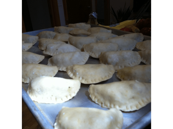 - Fill one half full with meat mixture, fold dough over and seal tightly. Dampen edges with water and crimp edges with fork.