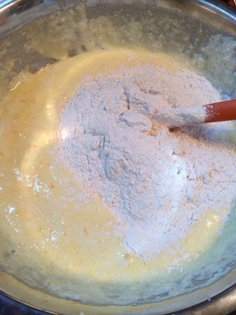 Fold half of the egg whites into the batter, followed by half of the flour mixture. Continue with the second half of the whites and the second half of the flour.