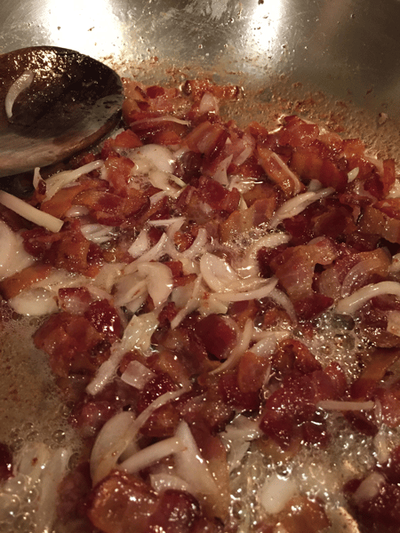 - Heat a small sauté pan over medium-low heat and add the bacon. Cook, stirring occasionally, until golden brown and crisp. Using a slotted spoon, transfer the bacon to a paper towel-lined plate but leave the bacon fat in the pan.