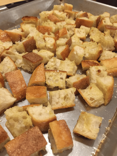 Preparing homemade croutons is quite simple, and tastes so much better than the store-bought variety. The cool thing about croutons is you can use any bread you like. Whatever you have tucked in the back of your freezer will do (as long as it doesn't have freezer burn). Just cut the bread into bite-size pieces, toss with olive oil, salt and pepper, and bake until lightly golden around the edges.