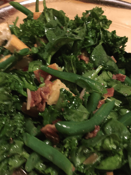 When shopping for the ingredients, I honestly had a hard time finding the frisée I normally use, but don’t let this discourage you. I had a feeling it would be hard to come by, so I had a plan B in place. I chose to make this version with kale and baby spinach, which tuned out to be an awesome substitution. I bought a bunch of kale, tore it into small bite-size pieces, and gave it a whirl in my salad spinner to ensure it was free from any grit. As far as the spinach goes, I bought a bag of baby spinach to keep things easy. Just note that heartier greens are a must for this recipe. Delicate greens such as leaf lettuce and spring mix will not stand up to the warm bacon vinaigrette.
