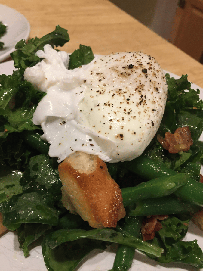 Traditionally, salad Lyonnaise doesn’t have any other ingredients, but don’t let that stop you from adding what you like. I wanted to bulk up the salad with an additional vegetable, so I blanched and shocked a couple handfuls of green beans. This means to boil the beans in a pot of salted water until crisp-yet-tender. You then transfer the vegetables to a bowl of ice water to stop the cooking process. I have to say they were a really great addition to the dish not only because they were delicious but texturally pleasing, too.