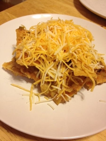 4. Place a spoonful of the salsa-coated chips on a plate, and top with any cheese you like. Something spicy is nice… maybe pepper jack.