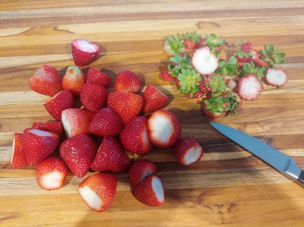- 1 lb strawberries OR 1.25 lbs peaches (the difference in weight is due to the fact that, between the pit and the skins, there is more waste with the peaches)