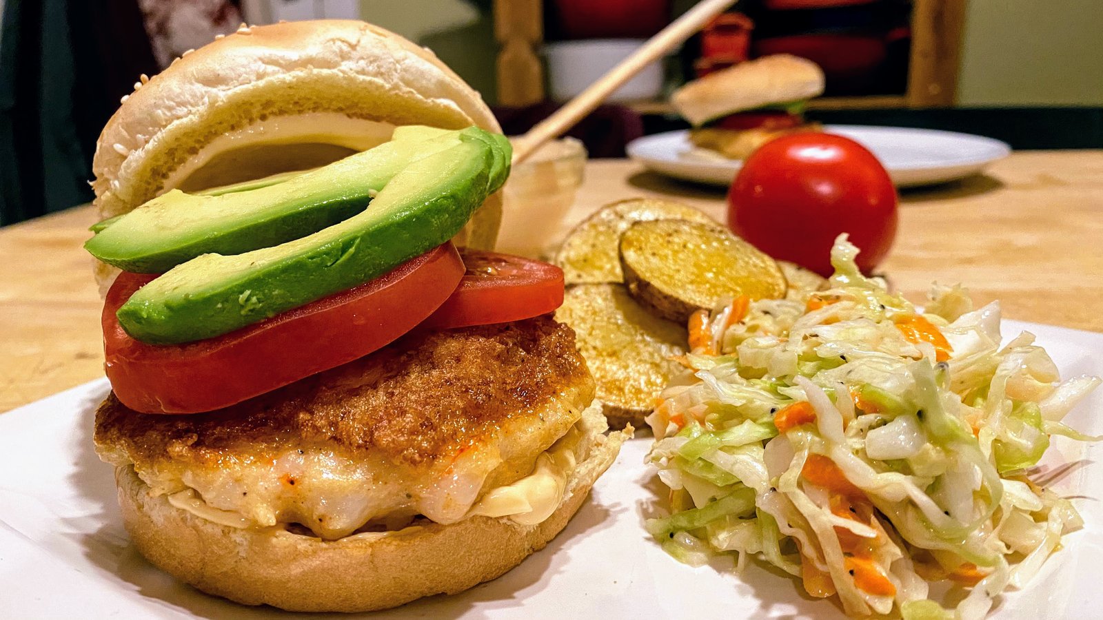 I like to keep my burger garnishes pretty simple, such as the spicy mayo, tomato and avocado, but feel free to get as creative as you like. I served our burgers with roasted potatoes and slaw, which were delicious accompaniments, but you can easily crack open a bag of your favorite potato chips and call it a day.