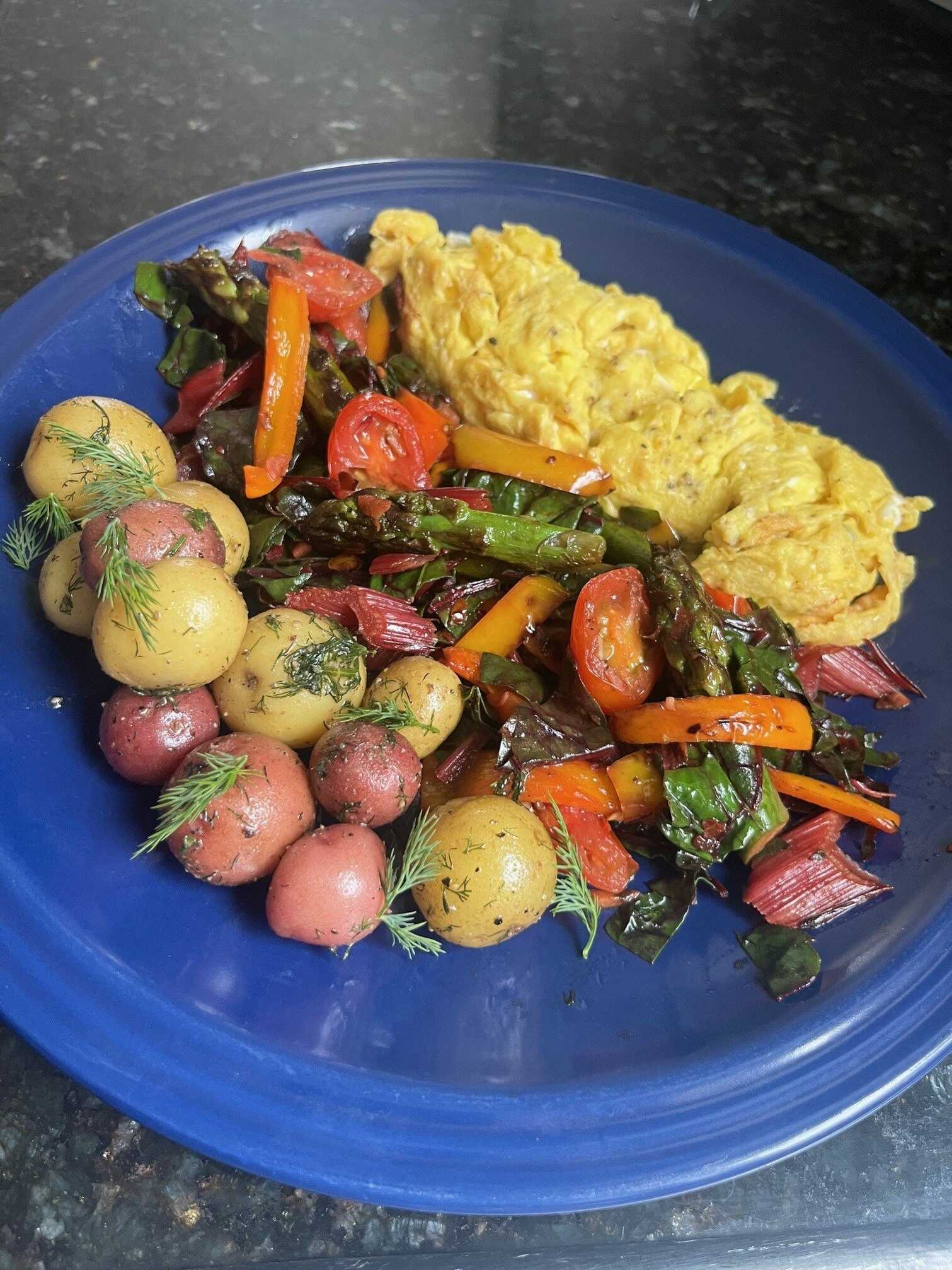 Soft Scramble Eggs, Boiled Baby Potatoes and Vegetable Sauté