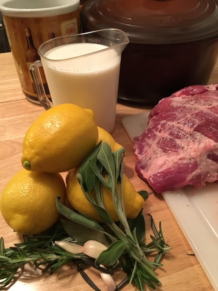 Maiale al latte was traditionally made with pork loin but nowadays, American pork is bred to be so lean that I prefer the pork shoulder which contains a bit more fat and connective tissue than the very lean loin cut and will add richness and succulence to the finished dish. Obviously, we cannot make milk-braised pork without milk and we’ll want to use whole milk, not skim or 2%. In addition to the pork and milk, you’ll also need a few other simple ingredients to add a bit more flavor; herbs, garlic, and lemon.