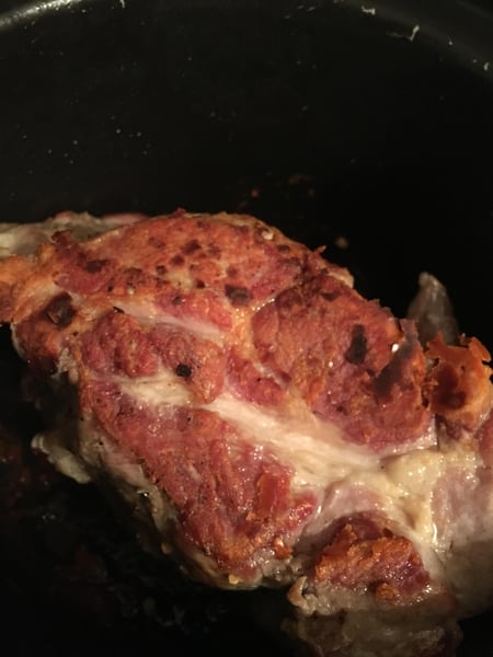 Add the browned pork back to the pot, cover, and transfer to the preheated oven. Braise for about 4 hours until pork is very tender, flipping the pork every hour. Allow the pork to cool for 20-30 minutes in the braising liquid and then remove.