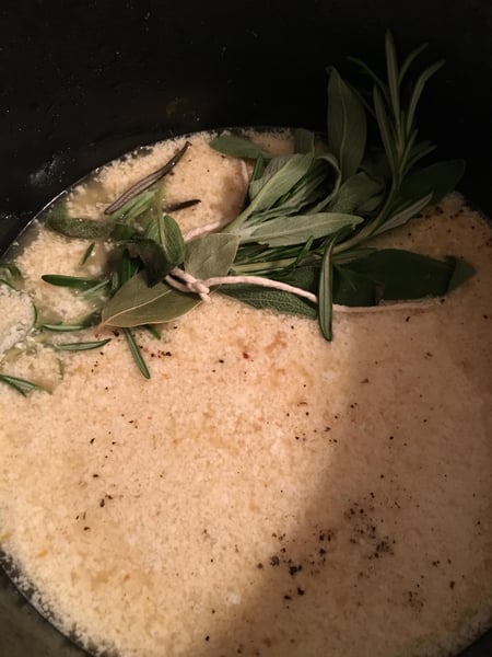 Tie the sage, rosemary, and bay leaf into a bundle with butcher’s twine and add to the pan along with the smashed garlic. Sauté until fragrant (~ 30 seconds) and then deglaze with the lemon juice, scraping the brown bits from the bottom of the pan with a wooden spoon. As soon as the lemon juice is reduced by half, add the milk and bring back to a simmer. Season with salt and pepper.