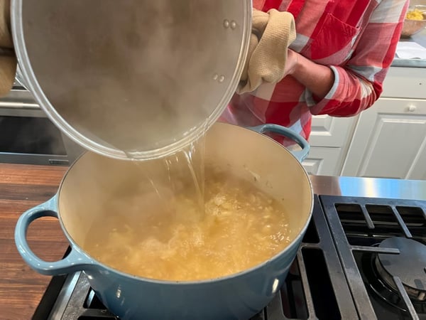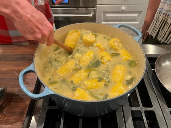 Add the reserved corn water and simmer while you prepare the remaining ingredients.