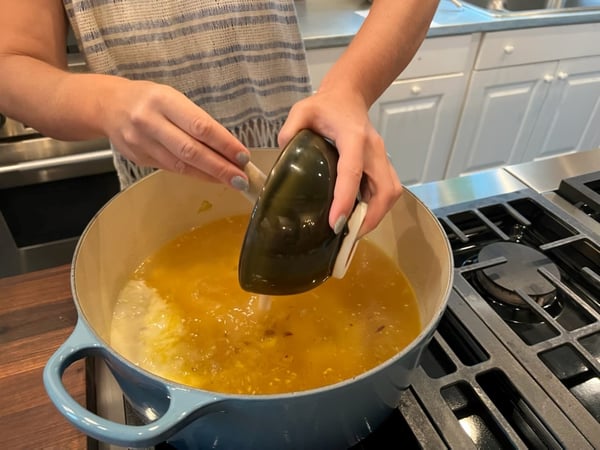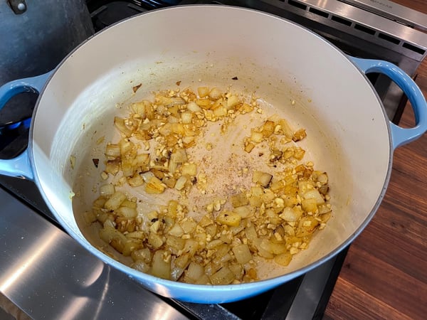 - Heat a 12-quart stock pot over moderate heat. Add 4 tablespoons of ghee and sauté onion until it just starts to brown. Add garlic and turmeric and sauté until garlic is aromatic, just a minute or two.