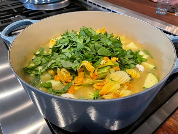 Next add the squash leaves, and squash blossoms and spinach and simmer for 5 minutes.
