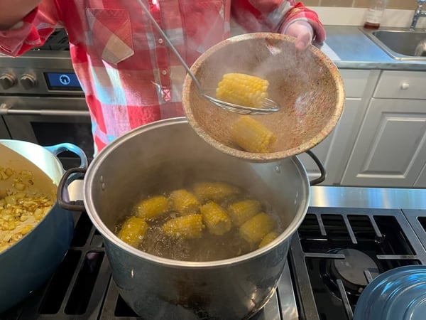 - Place corn into a 8-quart stock pot and cover with 6 quarts of water. Bring to a boil and reduce to a simmer for 10 minutes. Remove corn from the water and set aside. Reserve corn water for soup.