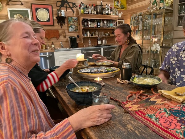 My neighbor Kathy reached out to see if I might like some soup her daughter was going to make for her. Her daughters Emily and Katie were in town: Katie from Oaxaca and Emily from New Orleans. Katie was going to make a traditional Oaxacan soup utilizing all parts of the squash plant: the fruit, the flowers and the most tender leaves and tendrils of the zucchini plant. My neighbors Kathy and Mike are also avid gardeners, in fact Kathy and I shared the chore of germinating plants for the garden this year… truthfully Kathy did most of the work (thank you Kathy, I’ll make it up to you next year). Kathy’s garden also had a bumper crop of squash, her assortment included zucchini which is traditional for this soup. I selfishly lured them in to coming over to my cooking studio so Katie could teach me the recipe. We had a wonderful evening laughing, cooking and getting to know each other. I’ll do my best to recreate the steps to make this fabulous soup.