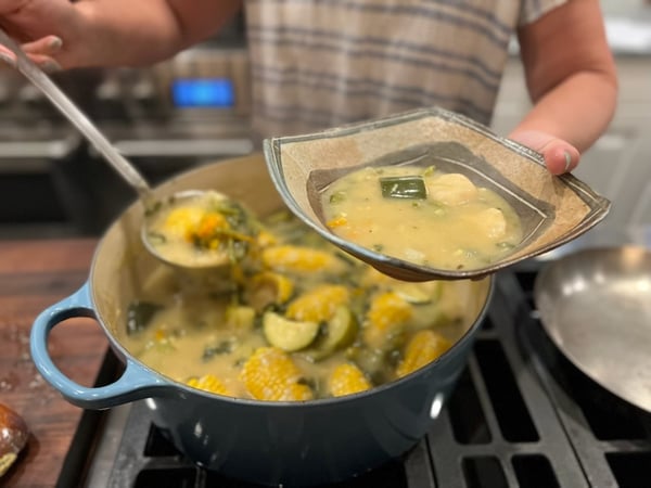 - To the warm masa corn stock, gently add the zucchini and follow with the masa dumplings and let simmer for 10 minutes. Do not stir but rather let the dumplings gently and fully cook before disturbing them.