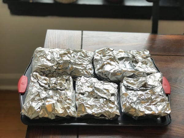 5. Individually wrap each section of rib tightly with foil. Place in the oven and bake for 2½ - 3 hours or until the meat is tender but not completely falling off the bone (some ribs may require up to 3½ hours). Remove ½ cup of the juices that have accumulated and set aside.