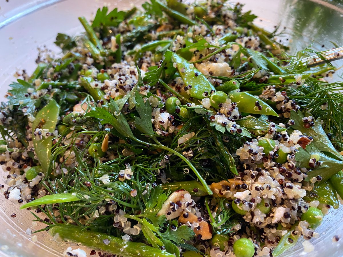 I grilled the veggies until they were bright green, crisp and tender. Because my asparagus was so skinny, it only took about 3 minutes per side. And, I had never grilled snow peas before but they were delicious with that bit of char. Once the veggies had cooled, I cut them into bite-size pieces and added them to the bowl with the fluffed quinoa.