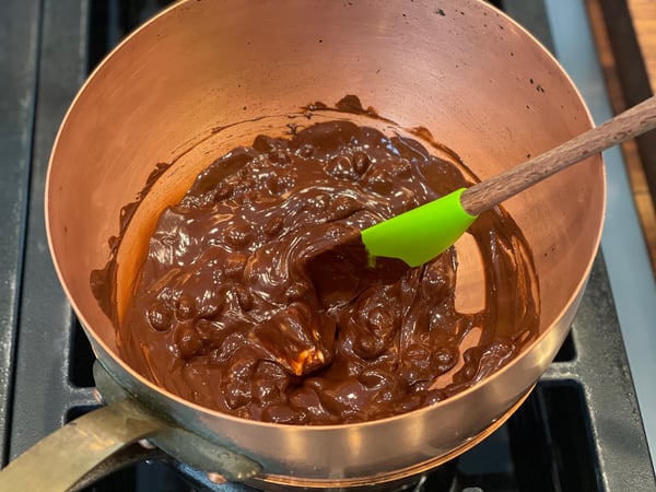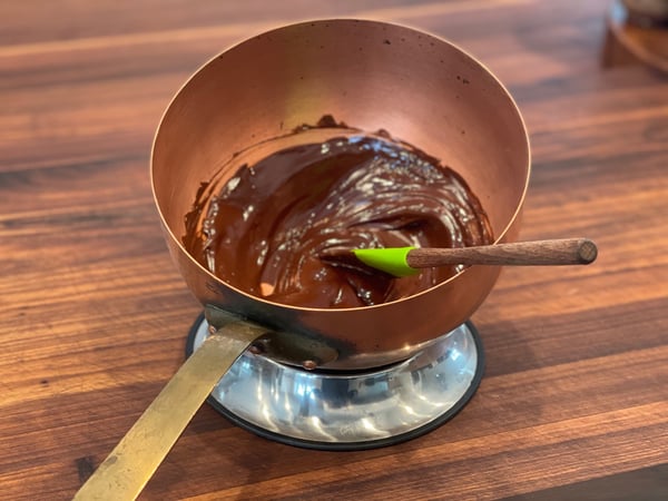 Bring the water to a simmer. Place chocolate and butter in the round bottomed bowl, turn the heat off and stir constantly until the chocolate and butter are melted. Remove the bowl of chocolate from the water bath and set aside.