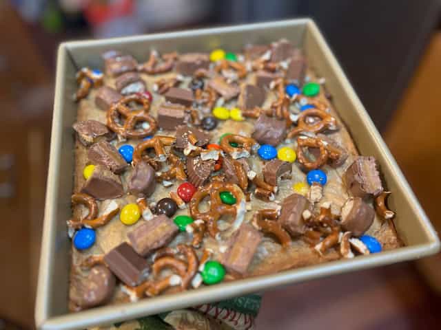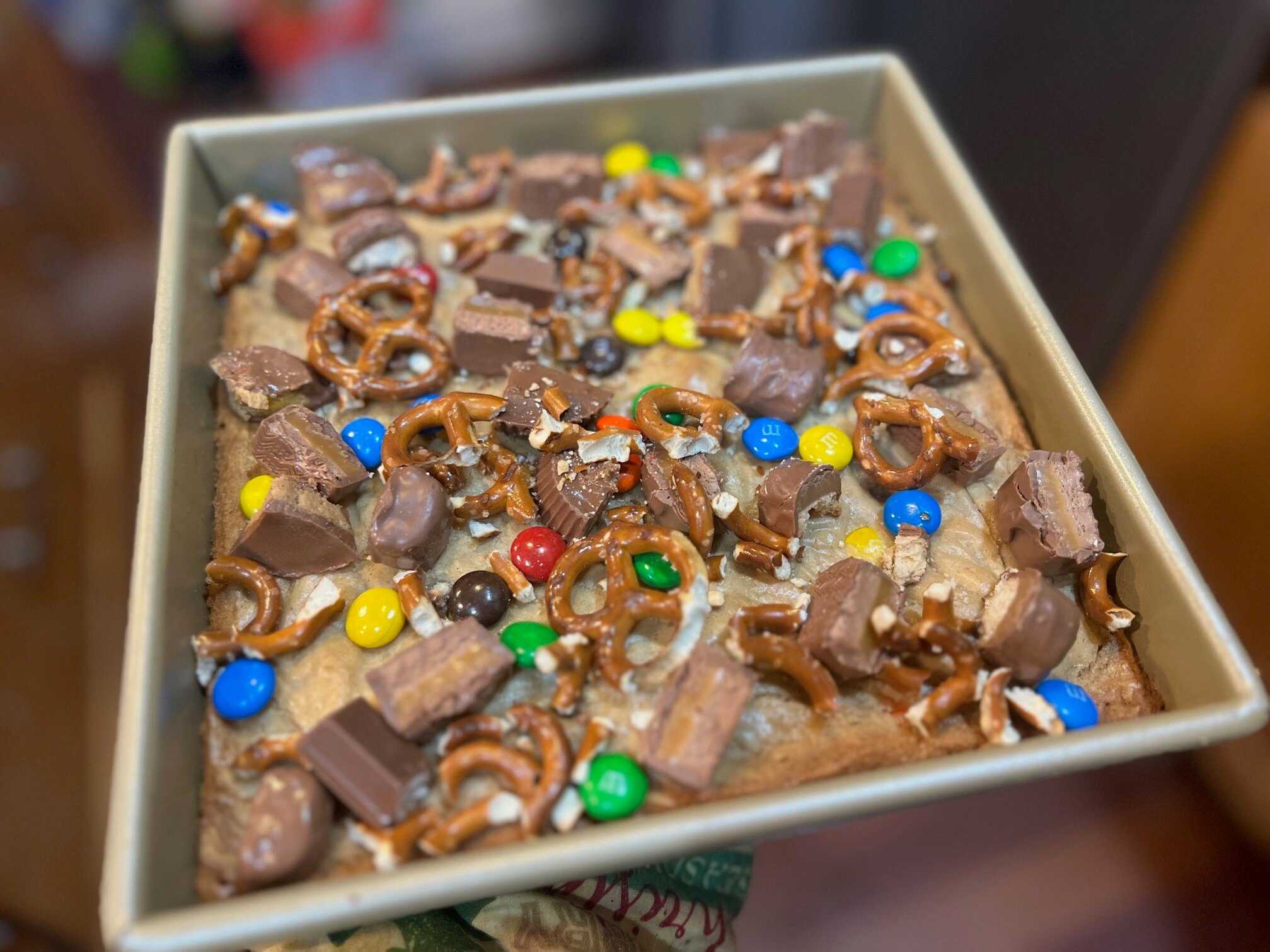 10. Wait 5 minutes, and then top the cookie bars with the reserved candy, pretzels and/or flaky salt.
