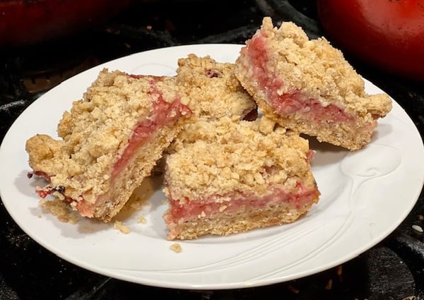 I love bar cookies because they’re portable and a quick way to make dessert for a crowd, and they’re the best way to ensure my husband doesn’t destroy my creations as he’s always on the hunt for the crust! So, with that in mind, I decided strawberry rhubarb crumble bars would be my best bet. These bars would be perfect for your next picnic, barbecue, beach day, or in my case, whenever I’m missing my mom more than usual! I love that these bars are quick to put together, but be sure to leave lots of time for them to cool so that the filling can set and they cut nicely (I let mine cool overnight so that I wouldn’t be tempted).