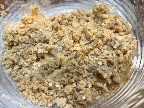 3. Add melted butter and vanilla to dry ingredients and combine. The mixture should be moist, but have chunks (like wet sand).