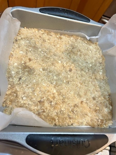 - Press 2/3 of the crumb mixture firmly into the pan, making sure to reach the edges and the corners (this will be your crust).