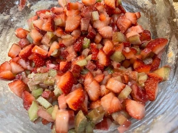 6. In a medium bowl, mix together the strawberries, rhubarb, lemon, 1/2 cup granulated sugar, and cornstarch.