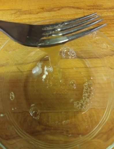 So give them a good whip with your fork. They should stream off the fork nice and evenly. They will likely be a bit foamy now.