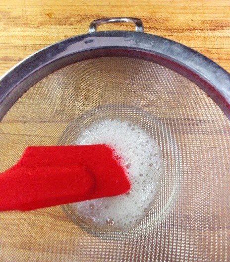 I use a rubber spatula to sort of press the egg whites through the mesh. Not everyone takes this step, but it works for me. I find that the extra 2 or 3 minutes this takes makes it SO much easier to apply the egg white to the flower petals – the foam doesn’t get in the way of me seeing what I’m doing, plus the egg white itself is that much smoother for having been pushed through all those little holes!