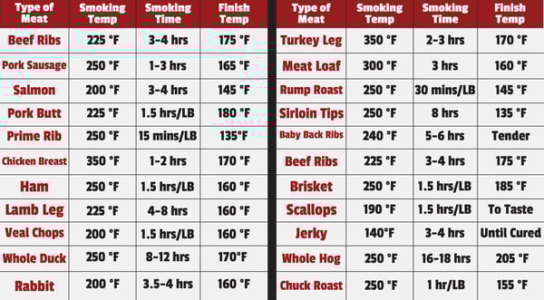 When you are setting up the pit, you need to get the charcoal started first. I use a chimney coal starter to get some of my coals hot. Once they are going, I dump them into the bottom of the barrel in the coal chamber with the rest of the coals. I then add my wood to the coals and mix them in so some of the wood gets buried. Below I have provided a general temperature and timing chart for reference to guide you in your smoking journey. These are just guidelines and I recommend using a probe thermometer to ensure smoker temp as well as internal temperature. In general, when you are smoking you usually want to stay around 250 to 300 degrees. That is the sweet spot of cooking low and slow.