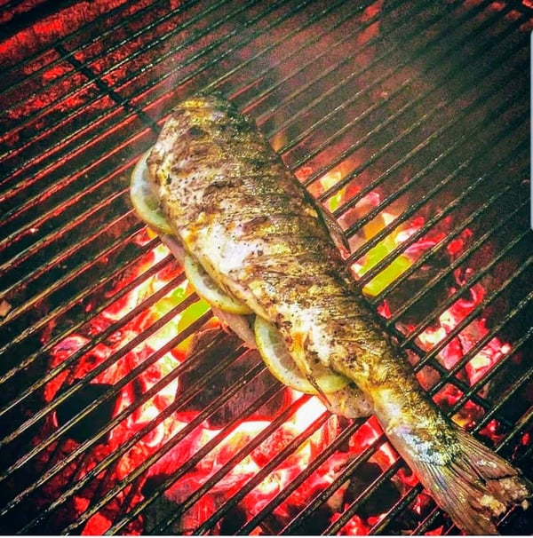 I do this method of grilling/smoking on my Weber charcoal grill when I am cooking lean proteins, veggies, and other general food items that don’t need to cook for very long on the grill, but I still want to have that smoke flavor. Sometimes with charcoal grills it is difficult to control the overall heat of the grill so by cooking at a higher temperature and adding soaked wood chips to the charcoal you are adding flavor, and you do not have to man the grill for hours on end. For example, this grilled and smoked stuffed Coho salmon my husband caught pictured below on the Weber:
