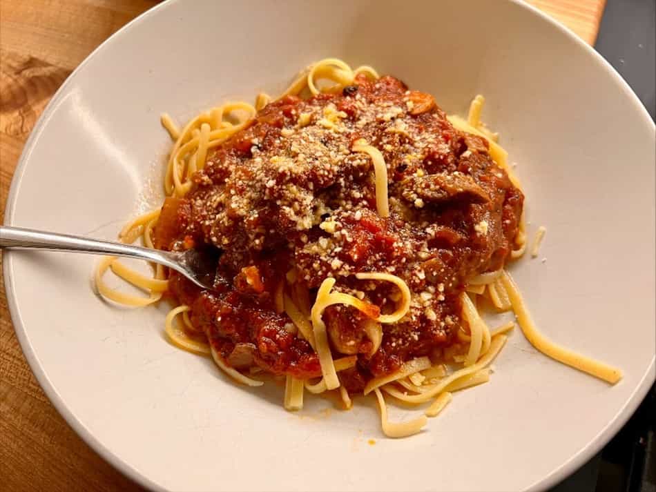 Besides the tomatoes, fresh onions, garlic, and fresh herbs to finish are your best bet. To add more flavor to the sauce, incorporate some dry wine along with beef or chicken broth. Pair the finished ragù with your favorite pasta or some polenta.