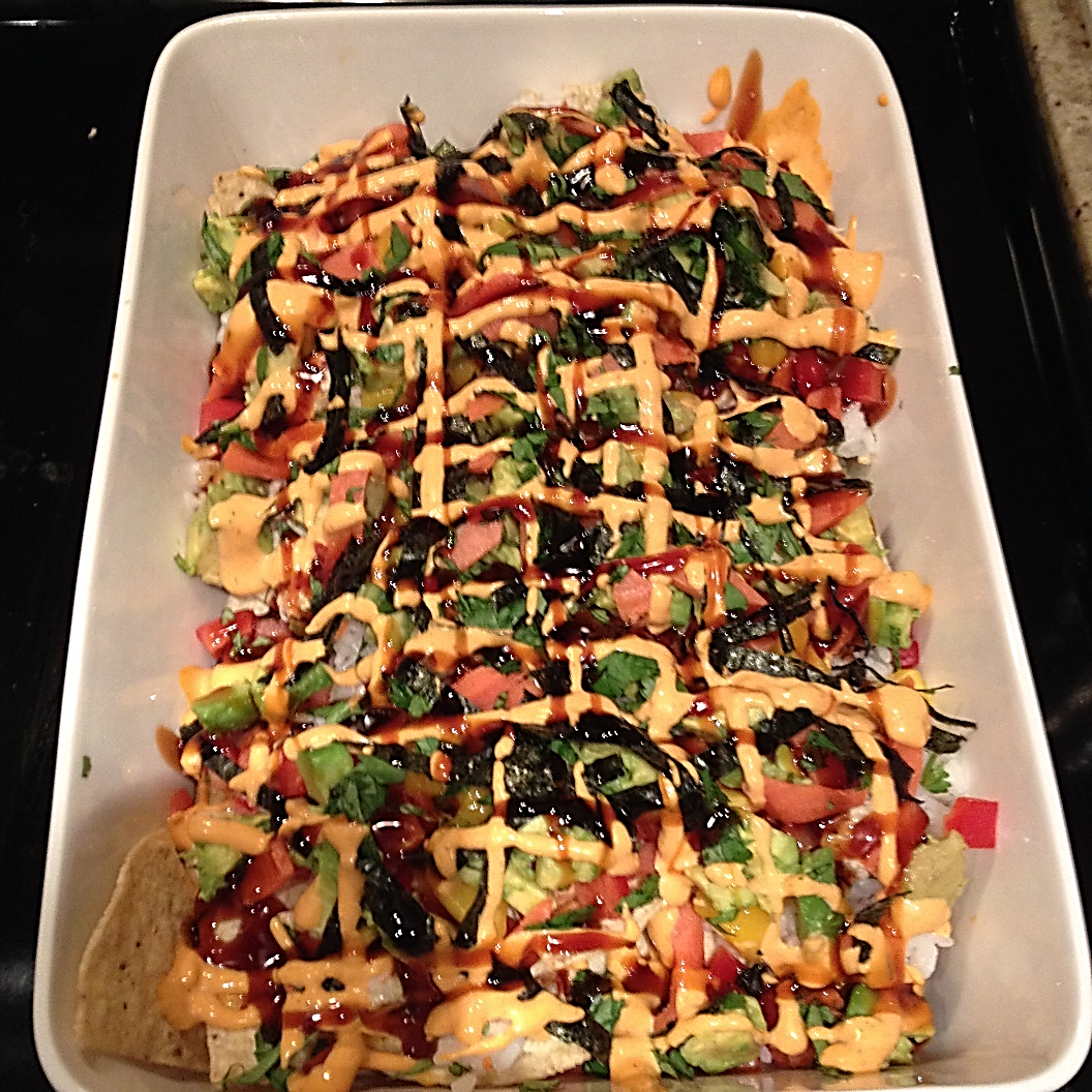 The idea for Sushi Nachos spawned from the idea of restaurants serving tuna tartare with an abundance of avocados and tortilla chips and a lack of regular sushi ingredients. Just like any other massive overly indulgent nacho you see in pubs and bars, this is a layered dish piled high. In my first time creating this hybrid monstrosity, I used what I had available: