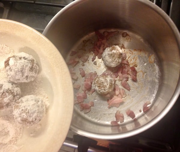 - Brown in the bacon drippings in batches, removing as they brown. Add all sauce ingredients except the flour to the same pan and simmer, scraping up bits from the bottom of the pan. Continue to cook and serve as above.